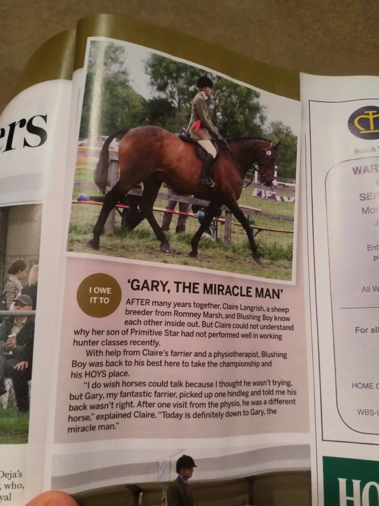 Sometimes the problems that I treat do not cause the horse to go lame or stop work completely but may just manifest as a slight drop in performance. Claire had noticed that Harry wasn’t performing as he normally did in the ring. Her farrier also noticed he wasn’t himself at shoeing, and as Claire mentions in this article, it only took one treatment to get him back to his winning ways 😍