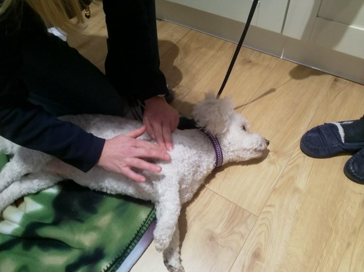 We had some new dogs in the group this session but they fitted in really well and they all enjoyed their massages. This canine group also seem to have cracked Jinny who allowed lots of different massage strokes all over her body. I think Katy felt she had drawn the short straw when I told her Jin was going to be her assessment dog, however she worked wonders on her and Jin actually allowed her to do limb stretches (as shown above) that she normally would not tolerate 😊